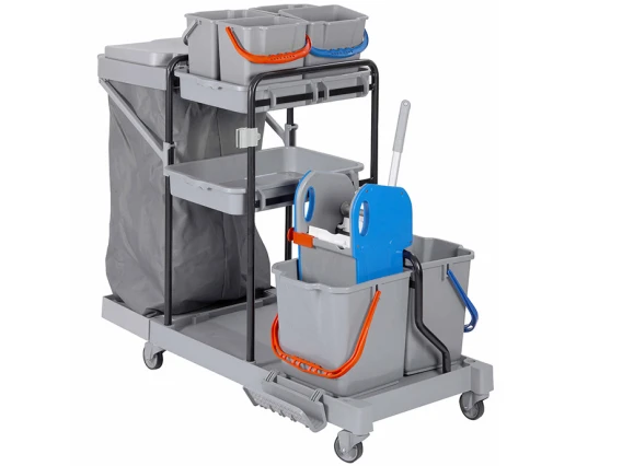 Ce chariot multifonctionnel sert au dépoussiérage, à la collecte des déchets, au lavage des sols et au nettoyage des surfaces.