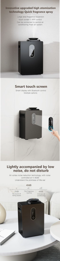 Smart Control Scent diffuseur Q3000PRO adopte la technologie d’atomisation à deux fluide pour rendre la brume aussi petite que la particule micron, ce qui fait que le parfum se propage uniformément et parfume longtemps dans l’espace. Cette machine à parfum est un stylemural ou autonome et il peut également être connecté à un système HVAC pour l’espace 4000 mètre cube