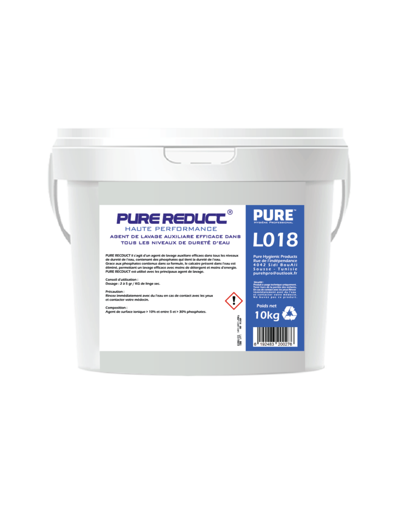 PURE RECDUCT il s’agit d’un agent de lavage auxiliaire efficaces dans tous les niveaux de dureté de l’eau, contenant des phosphates qui tient la dureté de l’eau.