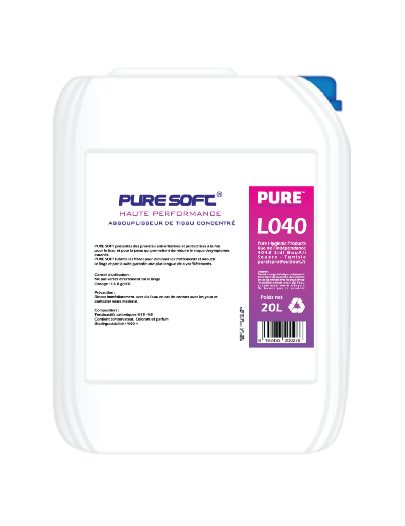 PURE SOFT lubrifie les fibres pour diminuer les frottements et adoucir le linge et par la suite garantir une plus longue vie a vos Vêtements.