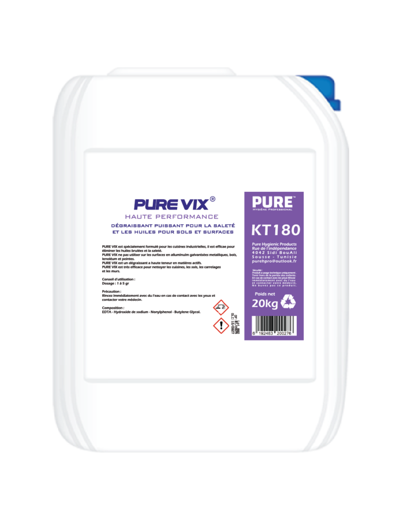 PURE VIX est spécialement formulé pour les cuisines industrielles, il est efficace pour éliminer les huiles brulées et la saleté.