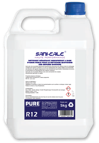 Sani-calc est un produit détartrant desinfectant moussant trés efficace dans le nettoyage complet des espaces sanitaire, et c’est un combinaison des acides faibles du tensioactifs, du solvants, des agents séquestrant et des désinfectant qui facilite l’elimination du tartre, la rénovation et la desinfection des espaces commun.